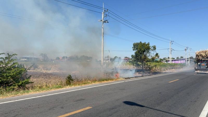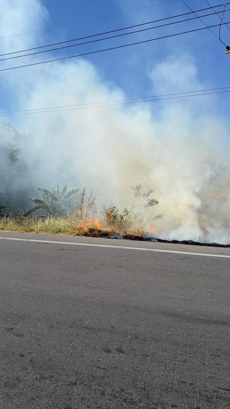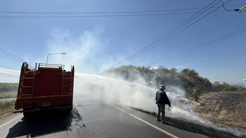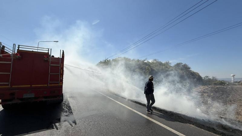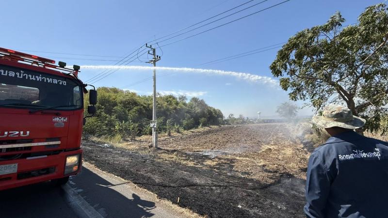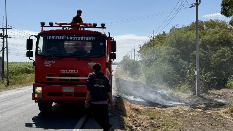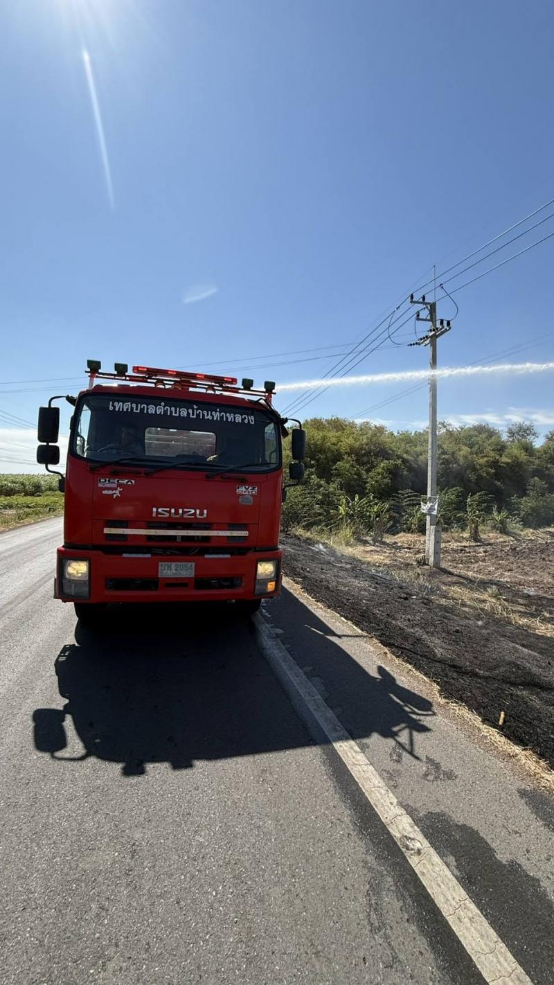 งานป้องกันฯ พร้อมเจ้าหน้าที่งานป้องกัน ฯ เทศบาลตำบลบ้านท่าหลวง ลงพื้นที่ระงับเหตุเพลิงไหม้ป่าหญ้าข้างทางเลยสี่แยก โรงงานน้ำแข็งท่าหลวง
