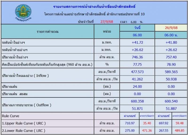 ????ปริมาณน้ำไหลลงอ่าง 477.57 ลบ.ม./วินาที หรือ 41.26 ล้าน ลบ.ม./วัน