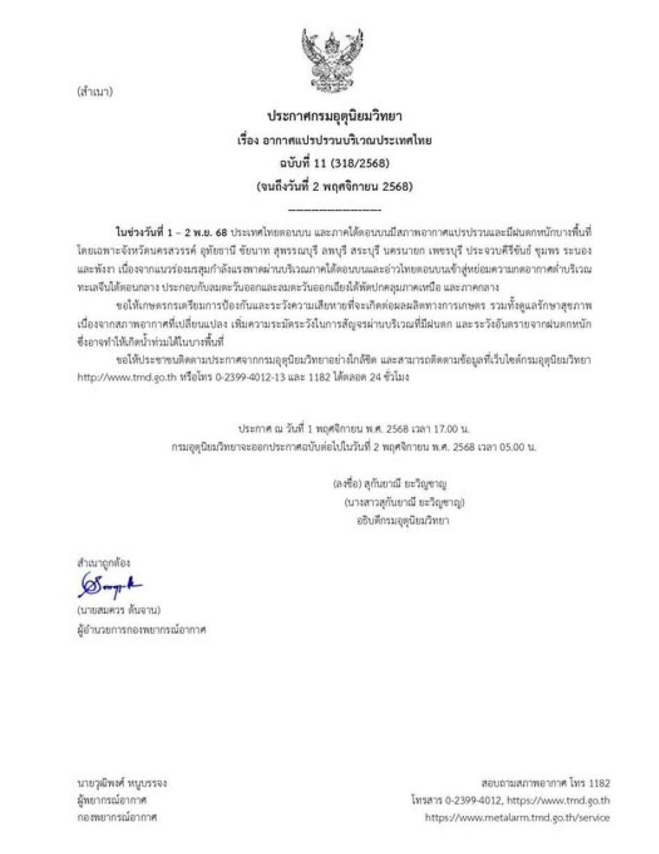 ประกาศกรมอุตุนิยมวิทยา เรื่อง อากาศแปรปรวนบริเวณประเทศไทย ฉบับที่ 11 (318/2568) (จนถึงวันที่ 2 พฤศจิกายน 2568) [2 พฤศจิกายน 2568]