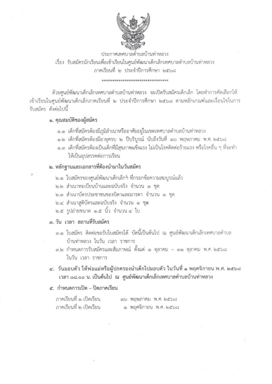 ประกาศรับสมัครนักเรียนเพื่อเข้าเรียนในศูนย์พัฒนาเด็กเล็กเทศบาลตำบลบ้านท่าหลวง ภาคเรียนที่ 2 ประจำปีการศึกษา 2568 [30 กันยายน 2568]