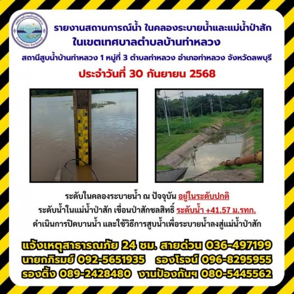 รายงานสถานการณ์นํ้า ในคลองระบายน้ำและแม่นํ้าป่าสัก ในเขตเทศบาลตําบลบ้านท่าหลวง สถานีสูบน้ำบ้านท่าหลวง 1 หมู่ที่ 3 ตําบลท่าหลวง [30 กันยายน 2568]