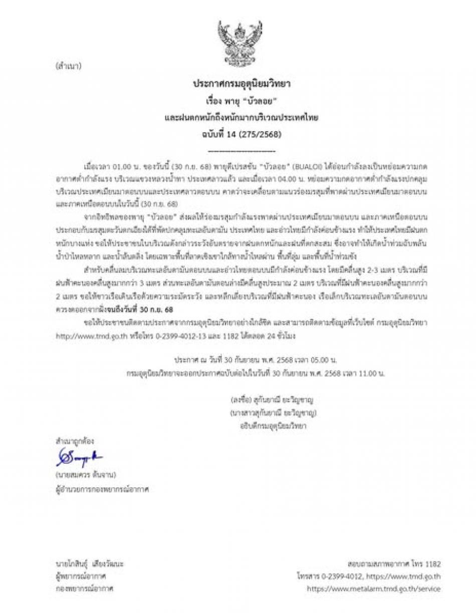 ประกาศกรมอุตุนิยมวิทยา เรื่อง พายุ “บัวลอย” และฝนตกหนักถึงหนักมากบริเวณประเทศไทย ฉบับที่ 14 (275/2568) [30 กันยายน 2568]