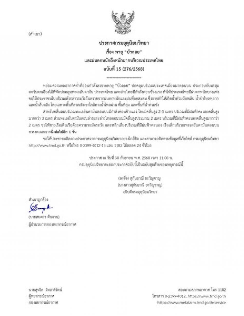 ประกาศกรมอุตุนิยมวิทยา เรื่อง พายุ “บัวลอย” และฝนตกหนักถึงหนักมากบริเวณประเทศไทย ฉบับที่ 15 (276/2568) [30 กันยายน 2568]