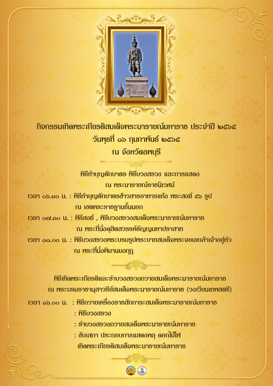 จังหวัดลพบุรีกำหนดจัดพิธีทำบุญตักบาตร พิธีบวงสรวง พิธีเทิดพระเกียรติและรำบวงสรวงถวายสมเด็จ พระนารายณ์มหาราช ประจำปี 2565 [13 กุมภาพันธ์ 2565]