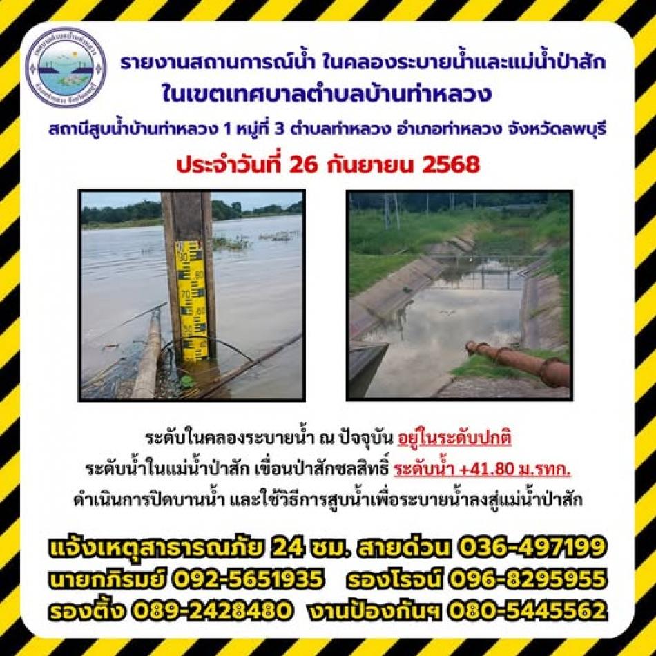 รายงานสถานการณ์นํ้า ในคลองระบายน้ำและแม่นํ้าป่าสัก ในเขตเทศบาลตําบลบ้านท่าหลวง สถานีสูบน้ำบ้านท่าหลวง 1 หมู่ที่ 3 ตําบลท่าหลวง [26 กันยายน 2568]