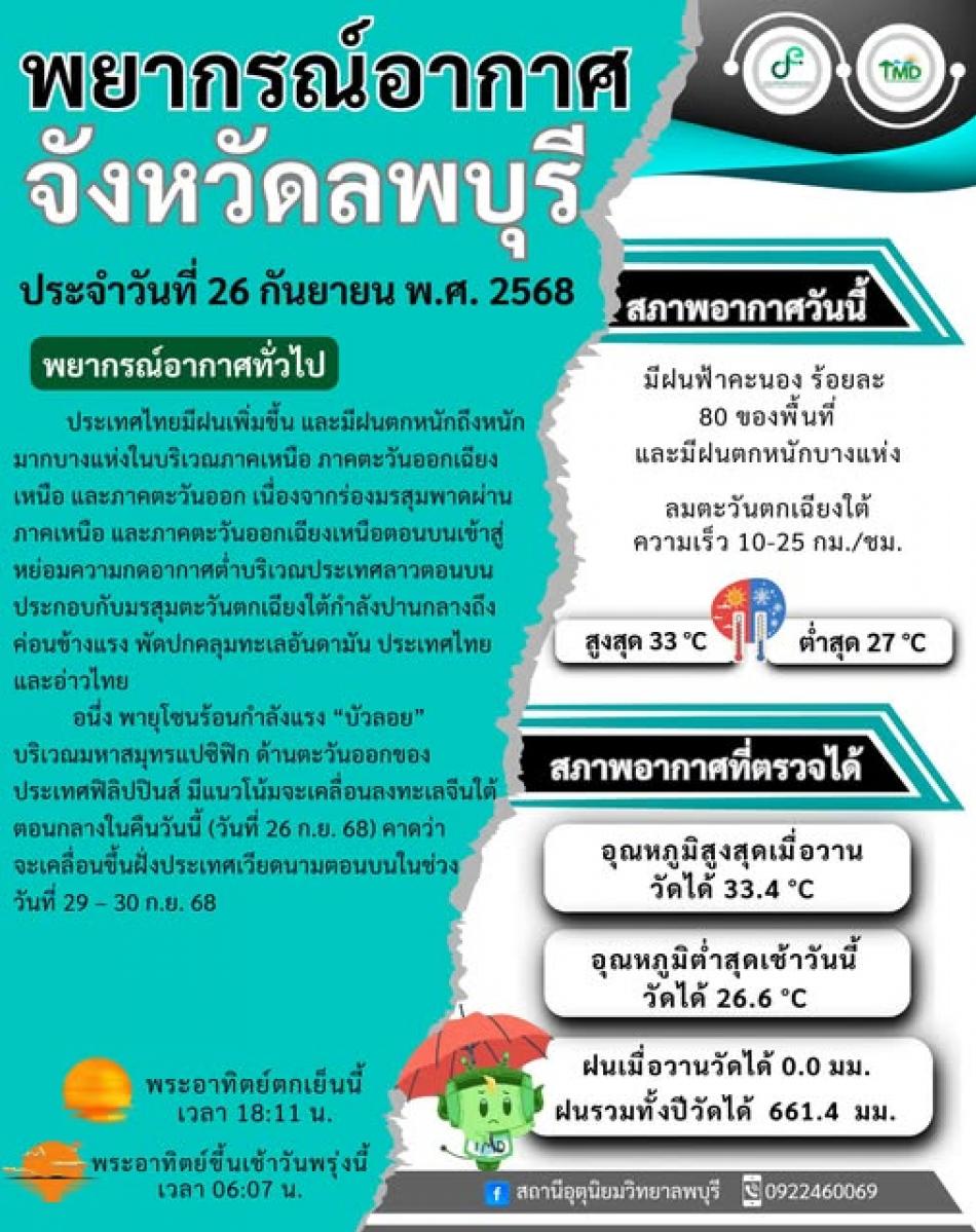 พยากรณ์อากาศจังหวัดลพบุรี ประจำวันที่ 26 ก.ย. 2568 [26 กันยายน 2568]