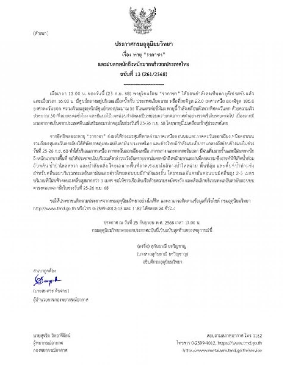 ประกาศกรมอุตุนิยมวิทยา เรื่อง พายุ “รากาซา” และฝนตกหนักถึงหนักมากบริเวณประเทศไทย ฉบับที่ 13 (261/2568) ฉบับสุดท้ายของเหตุการณ์นี้ [25 กันยายน 2568]