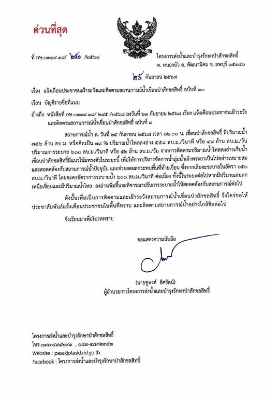แจ้งเตือนประชาชนเฝ้าระวังและติดตามสถานการณ์น้ำเขื่อนป่าสักชลสิทธิ์ ฉบับที่ 10 [26 กันยายน 2568]