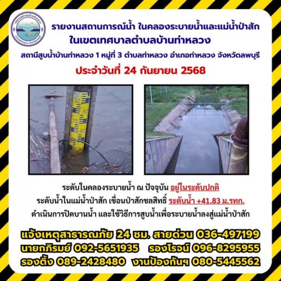 รายงานสถานการณ์นํ้า ในคลองระบายน้ำและแม่นํ้าป่าสัก ในเขตเทศบาลตําบลบ้านท่าหลวง สถานีสูบน้ำบ้านท่าหลวง 1 หมู่ที่ 3 ตําบลท่าหลวง [24 กันยายน 2568]