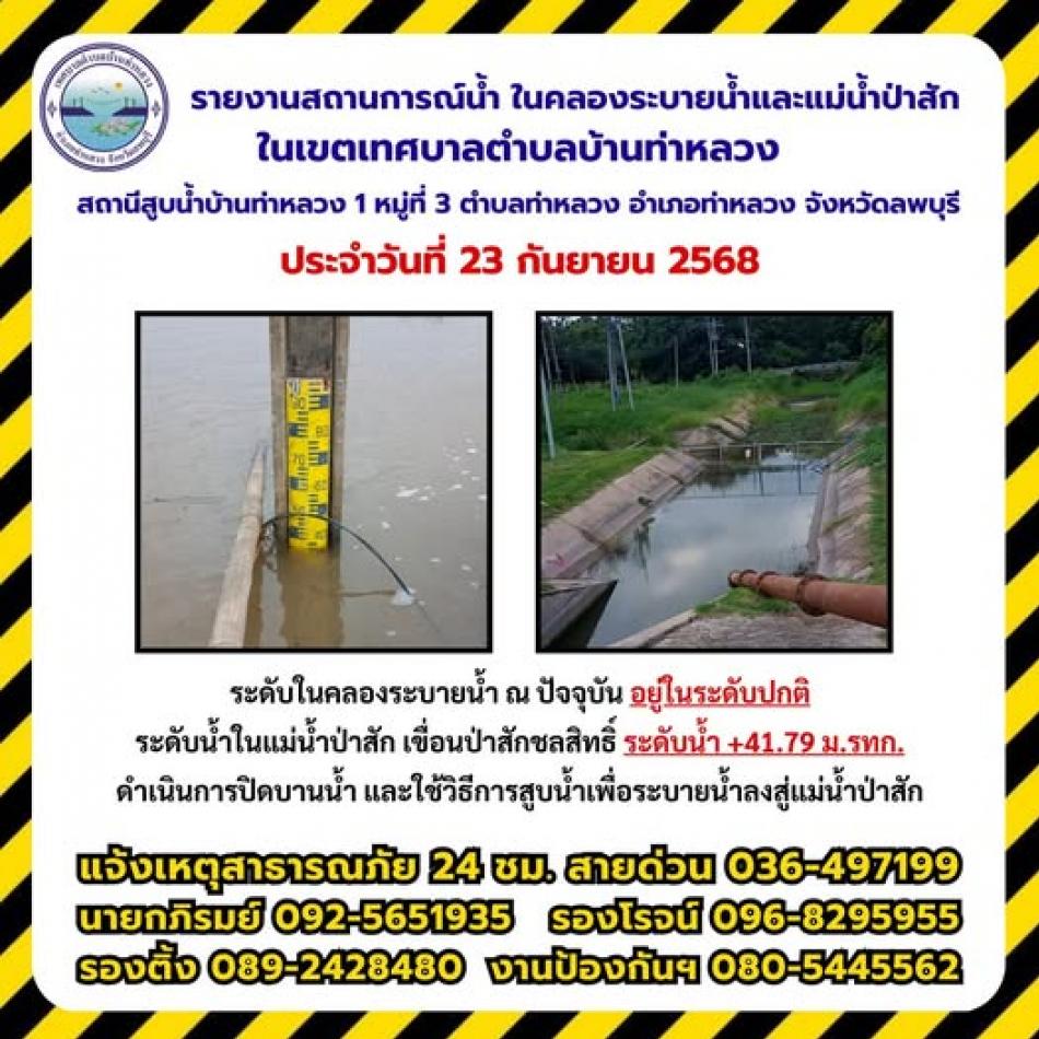 รายงานสถานการณ์นํ้า ในคลองระบายน้ำและแม่นํ้าป่าสัก ในเขตเทศบาลตําบลบ้านท่าหลวง ประจําวันที่ 23 กันยายน 2568 [23 กันยายน 2568]