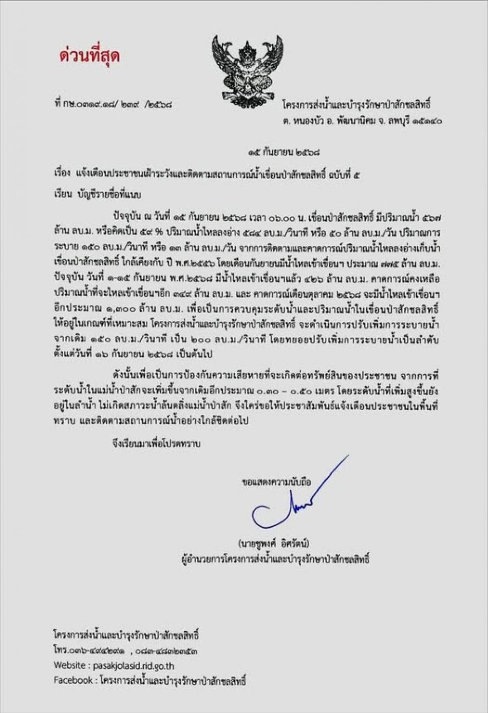 แจ้งเตือนประชาชนเฝ้าระวังและติดตามสถานการณ์น้ำเขื่อนป่าสักชลสิทธิ์ ฉบับที่ 5 [15 กันยายน 2568]