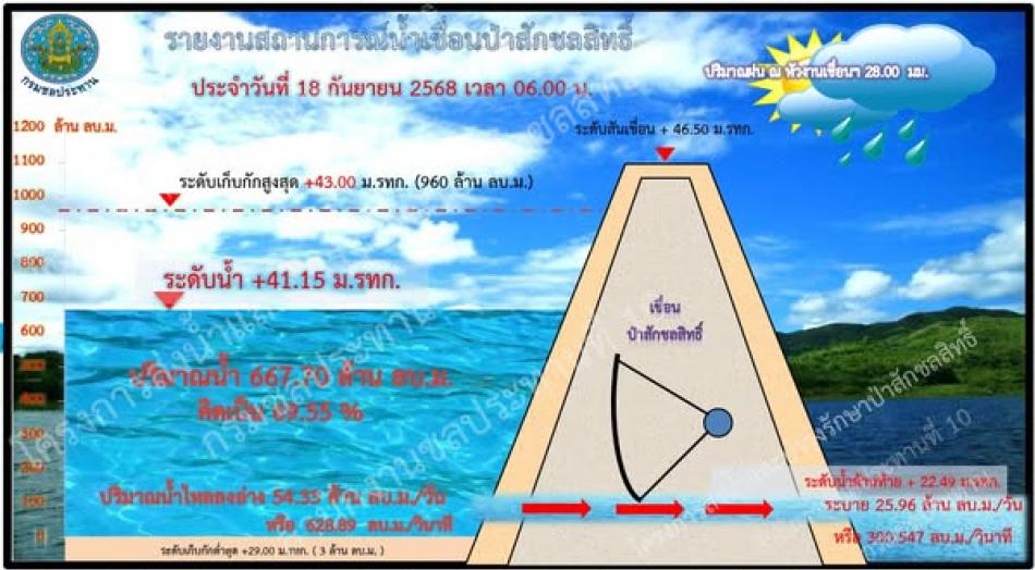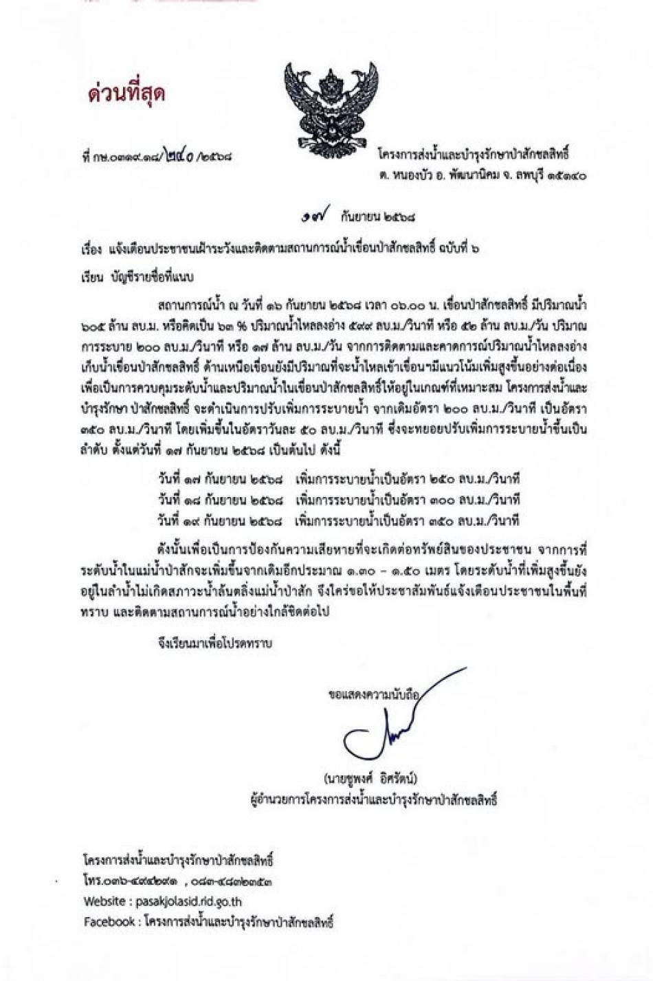 แจ้งเตือนประชาชนเฝ้าระวังและติดตามสถานการณ์น้ำเขื่อนป่าสักชลสิทธิ์ ฉบับที่ 6 [17 กันยายน 2568]