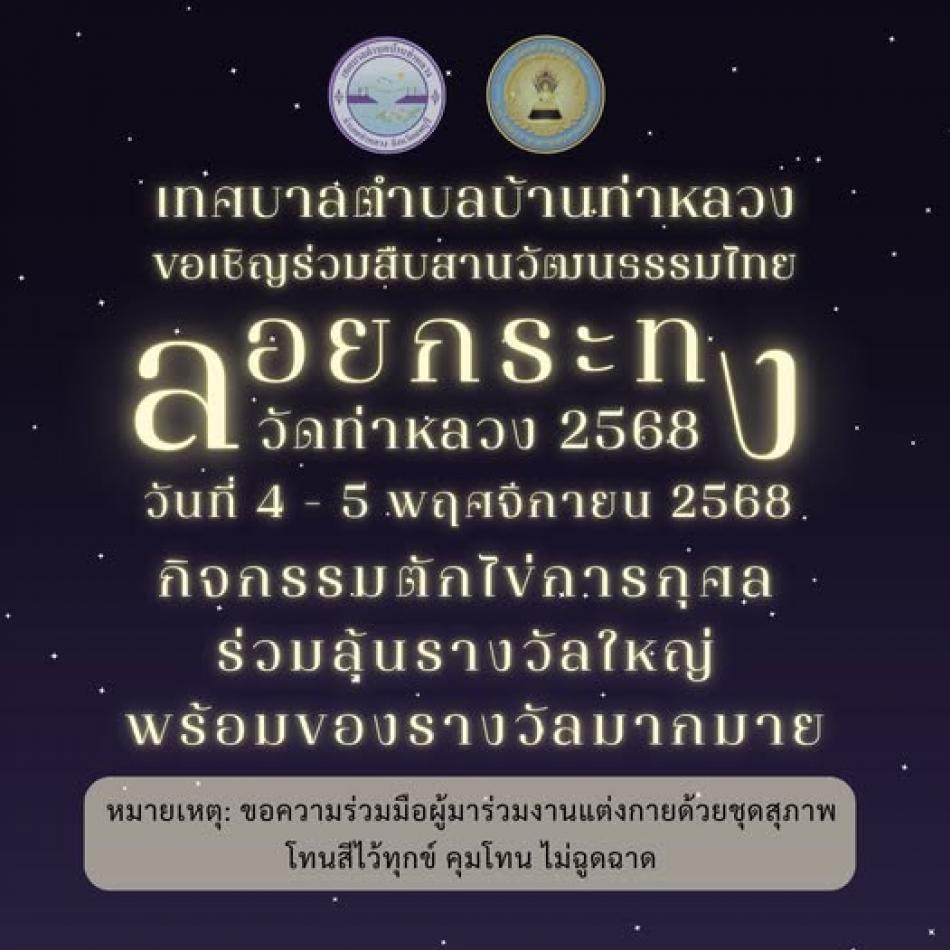 วัดท่าหลวง ร่วมกับ เทศบาลตำบลบ้านท่าหลวง ขอเชิญชวนร่วมสืบสานงานประเพณีลอยกระทง ประจำปี 2568 [29 ตุลาคม 2568]