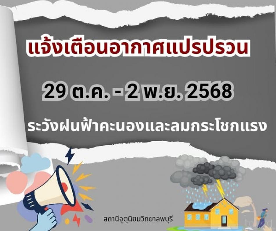 จ.ลพบุรีมีโอกาสเกิดฝนตั้งแต่วันที่ 29 ต.ค. นี้จนถึงวันที่2 พ.ย. 2568 [28 ตุลาคม 2568]