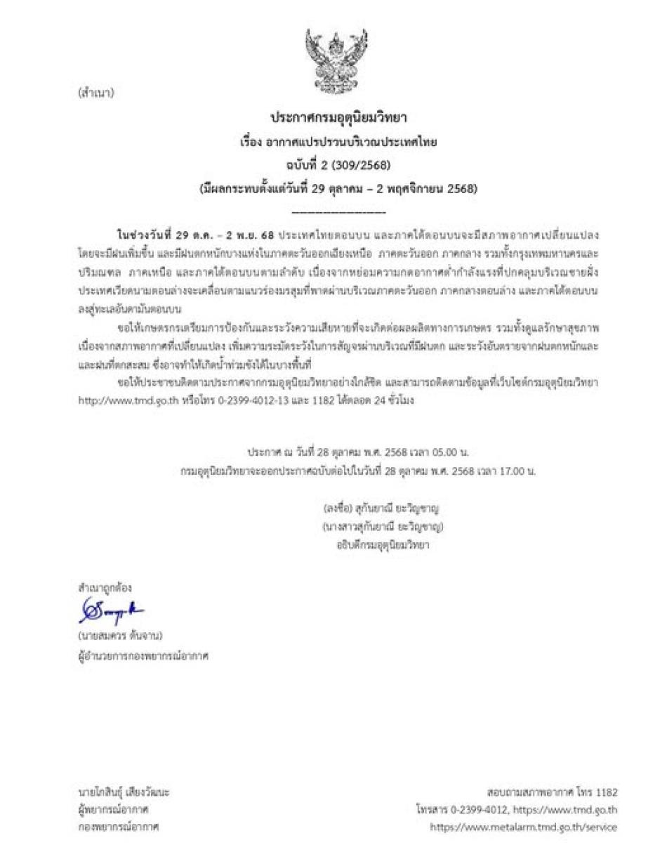 ประกาศกรมอุตุนิยมวิทยา เรื่อง อากาศแปรปรวนบริเวณประเทศไทย ฉบับที่ 2 (309/2568) (มีผลกระทบตั้งแต่วันที่ 29 ตุลาคม – 2 พฤศจิกายน 2568) [28 ตุลาคม 2568]