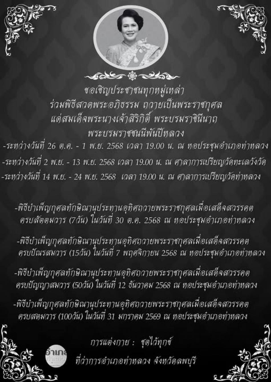 เทศบาลตำบลบ้านท่าหลวง ร่วมเป็นเจ้าภาพพิธีสวดพระอภิธรรมถวายเป็นพระราชกุศลแด่สมเด็จพระนางเจ้าสิริกิติ์ พระบรมราชินีนาถ พระบรมราชชนนีพันปีหลวง [27 ตุลาคม 2568]