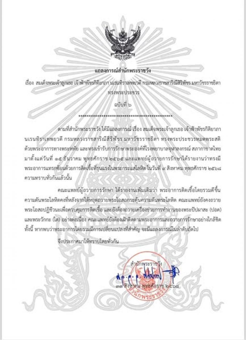 แถลงการณ์สำนักพระราชวัง เรื่อง สมเด็จพระเจ้าลูกเธอ เจ้าฟ้าพัชรกิติยาภา นเรนทิราเทพยวดี กรมหลวงราชสาริณีสิริพัชร มหาวัชรราชธิดา ทรงพระประชวร ฉบับที่ ๖ [31 สิงหาคม 2568]