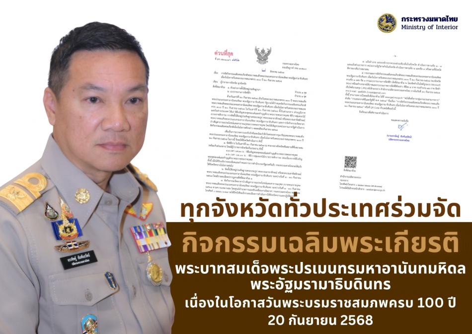 “มหาดไทย” แจ้งทุกจังหวัด อำเภอ และองค์กรปกครองส่วนท้องถิ่น ร่วมเฉลิมพระเกียรติพระบาทสมเด็จพระปรเมนทรมหาอานันทมหิดล พระอัฐมรามาธิบดินทร เนื่องในโอกาสวันพระบรมราชสมภพครบ 100 ปี 20 กันยายน 2568 [3 กันยายน 2568]