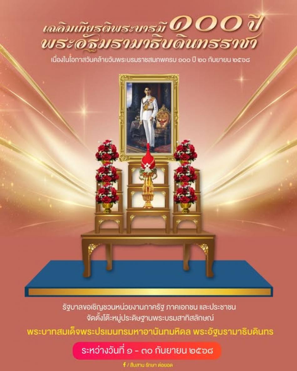 รัฐบาลขอเชิญชวนหน่วยงานภาครัฐ ภาคเอกชน และประชาชน จัดตั้งโต๊ะหมู่ประดิษฐานพระบรมสาทิสลักษณ์พระบาทสมเด็จพระปรเมนทรมหาอานันทมหิดล พระอัฐมรามาธิบดินทร เนื่องในโอกาสวันคล้ายวันพระบรมราชสมภพครบ ๑๐๐ ปี ๒๐... [3 กันยายน 2568]