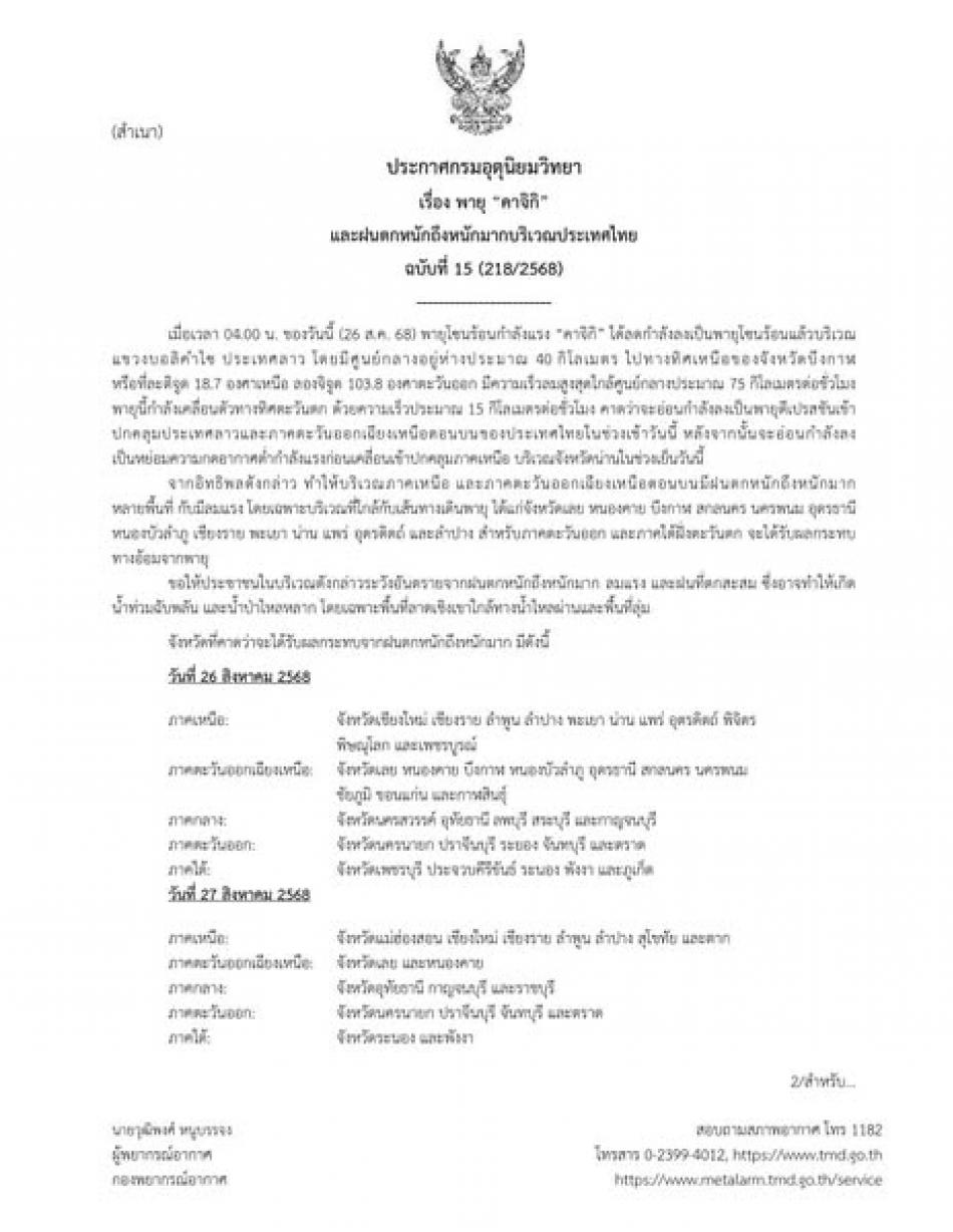 ประกาศกรมอุตุนิยมวิทยา เรื่อง พายุ “คาจิกิ” และฝนตกหนักถึงหนักมากบริเวณประเทศไทย ฉบับที่ 15 (218/2568) [26 สิงหาคม 2568]