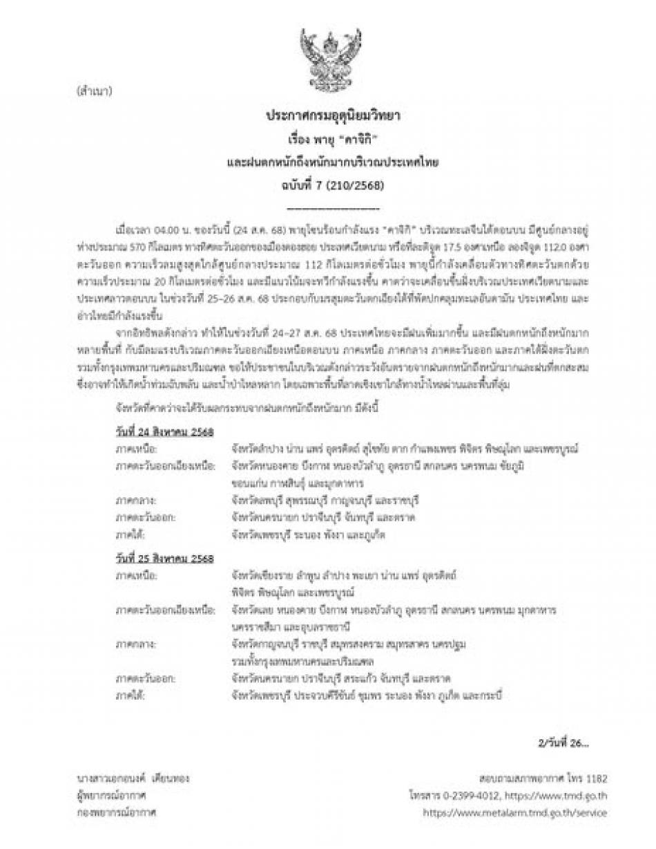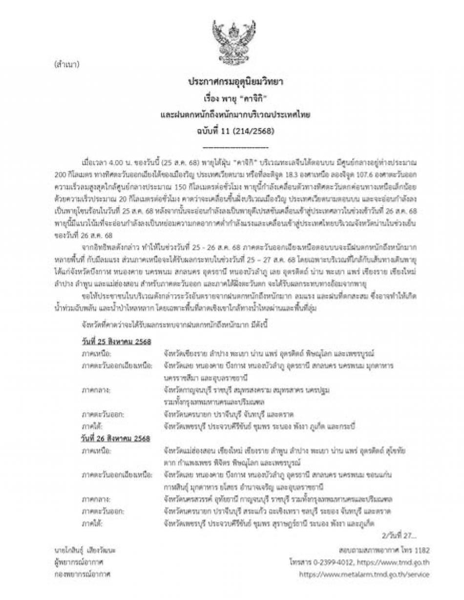 ประกาศกรมอุตุนิยมวิทยา เรื่อง พายุ “คาจิกิ” และฝนตกหนักถึงหนักมากบริเวณประเทศไทย ฉบับที่ 11 (214/2568) [25 สิงหาคม 2568]