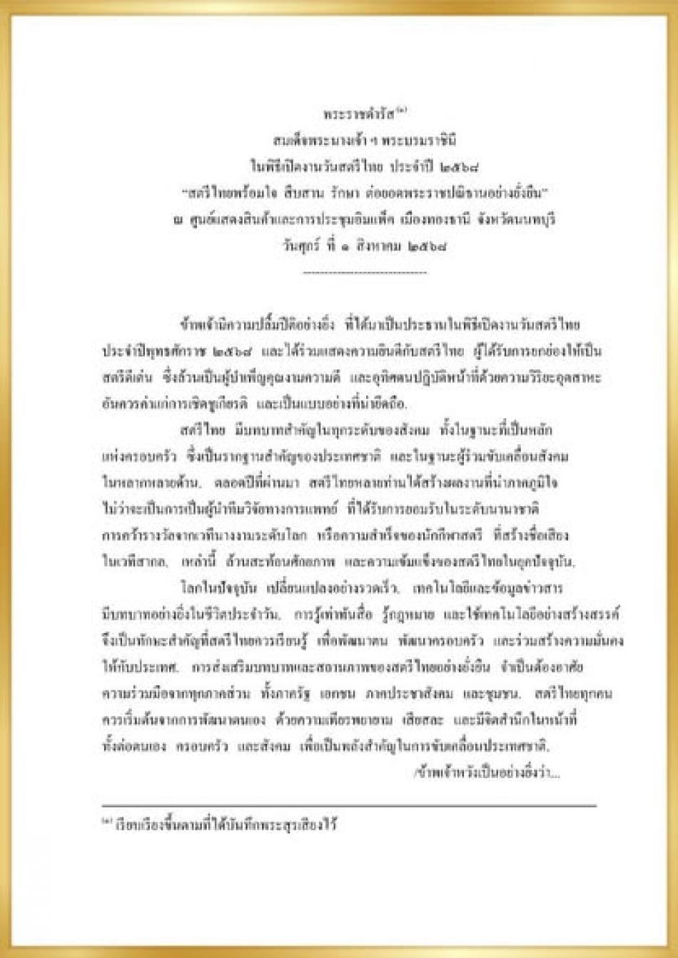 พระราชดำรัส สมเด็จพระนางเจ้า ฯ พระบรมราชินี ในพิธีเปิดงานวันสตรีไทย ประจำปี ๒๕๖๘ [2 สิงหาคม 2568]