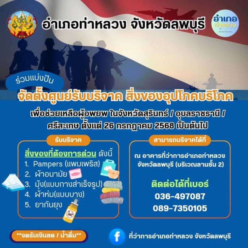 อำเภอท่าหลวง จังหวัดลพบุรี จัดตั้งศูนย์รับบริจาค สิ่งของอุปโภคบริโภค ณ อาคารที่ว่าการอำเภอท่าหลวง [28 กรกฎาคม 2568]