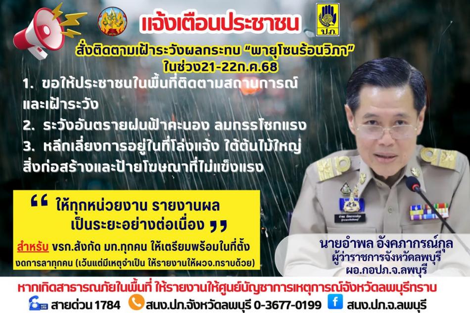 จังหวัดลพบุรี แจ้งเตือนประชาชนเตรียมพร้อมรับสถานการณ์ฝนตกหนักถึงหนักมากและลมกระโชกแรงจาก “พายุโซนร้อนวิภา” ในวันที่ 20-24 กรกฎาคม 2568 [20 กรกฎาคม 2568]