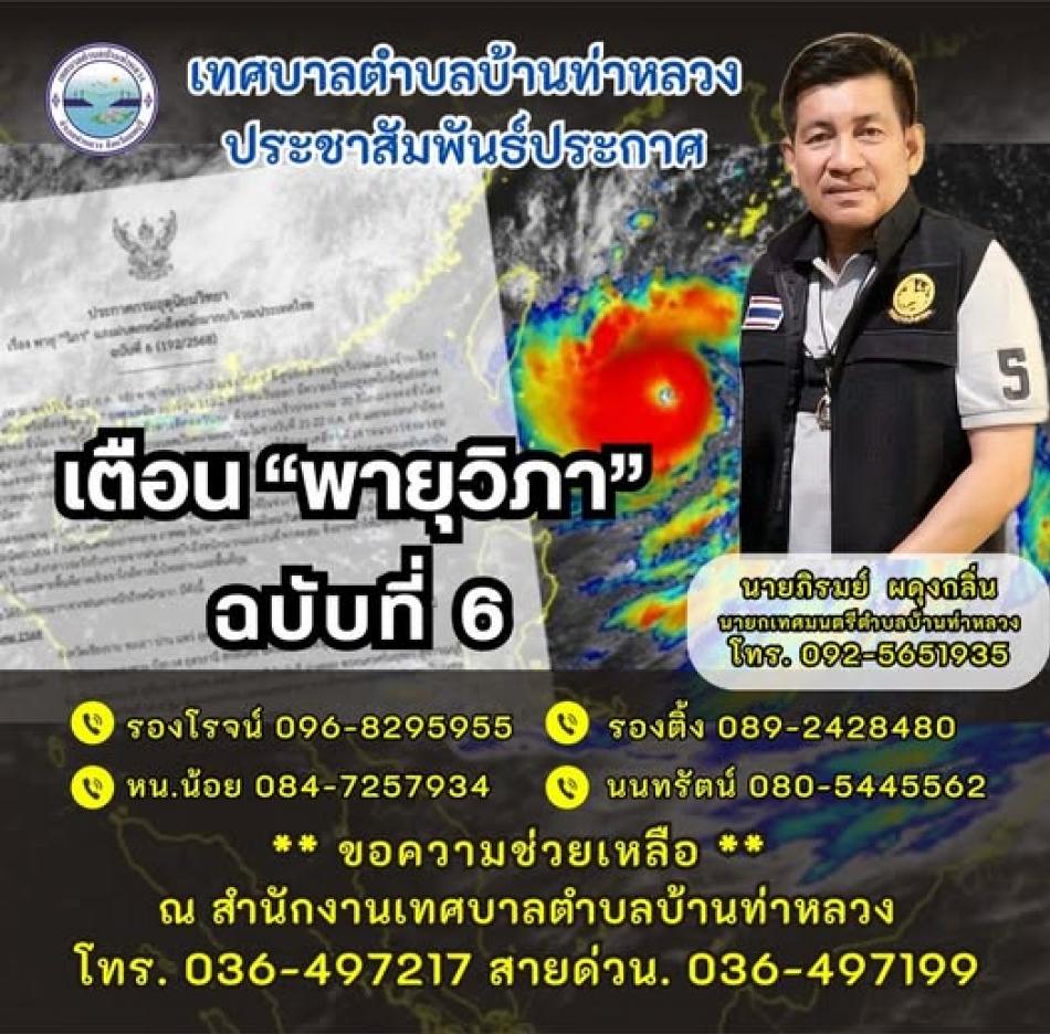 เทศบาลตำบลบ้านท่าหลวง แจ้งเตือนประชาชนเตรียมพร้อมรับสถานการณ์ฝนตกหนักถึงหนักมากและลมกระโชกแรงจาก “พายุโซนร้อนวิภา” ในวันที่ 20-24 กรกฎาคม 2568 [21 กรกฎาคม 2568]