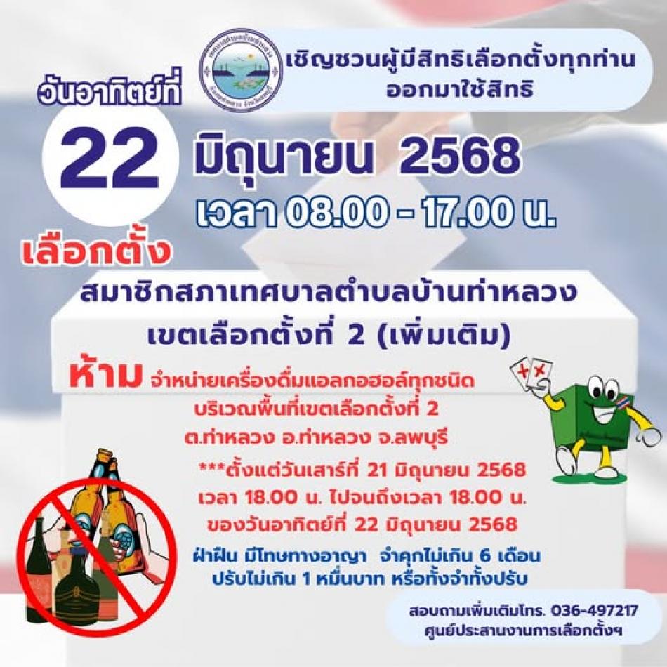 ขอเชิญชวนผู้มีสิทธิ์เลือกตั้ง มาใช้สิทธิ์ เลือกตั้งสมาชิกสภาเทศบาลตำบลบ้านท่าหลวงเขตเลือกตั้งที่ 2 (เพิ่มเติม) ในวันอาทิตย์ที่ 22 มิถุนายน 2568 [10 มิถุนายน 2568]