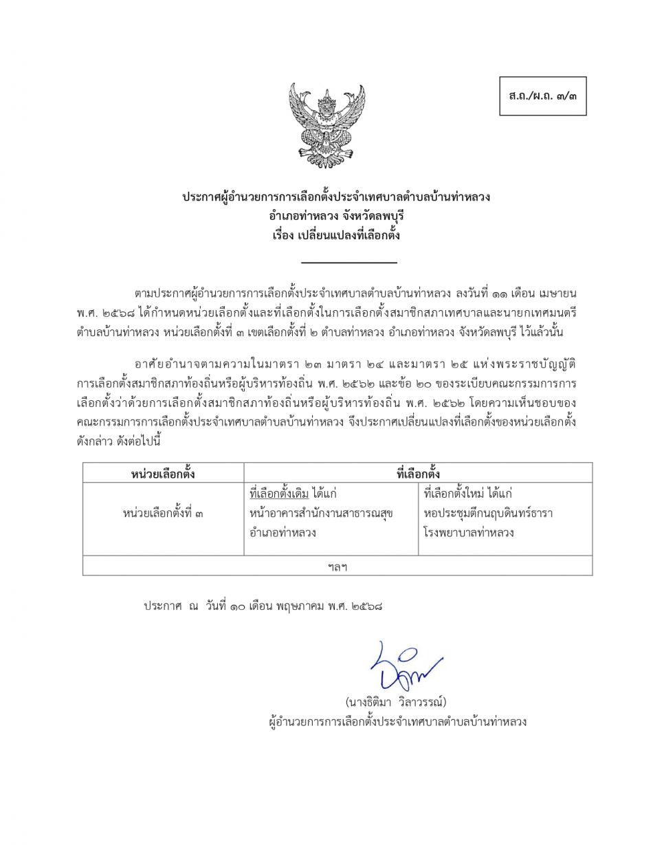 ประกาศผู้อำนวยการการเลือกตั้งประจำเทศบาลตำบลบ้านท่าหลวง เรื่อง เปลี่ยนแปลงที่เลือกตั้ง [10 พฤษภาคม 2568]
