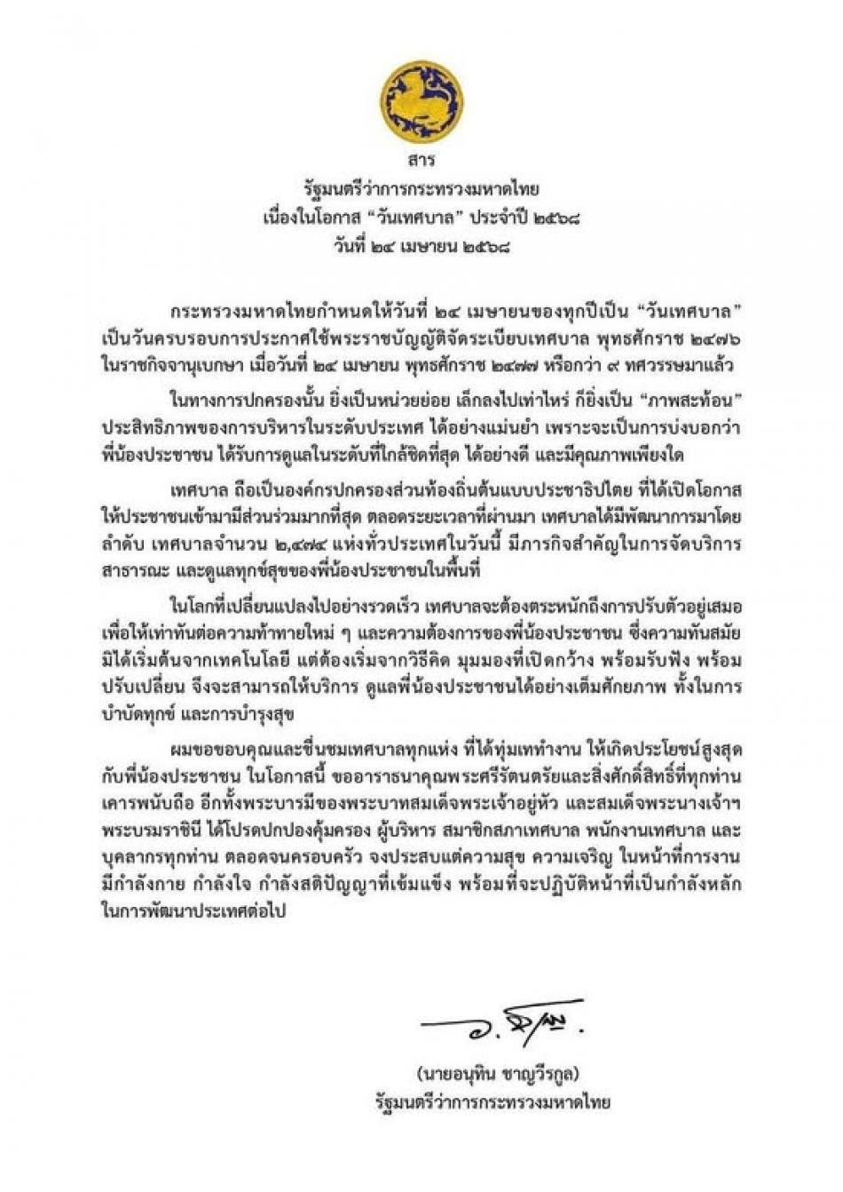 สารรัฐมนตรีว่าการกระทรวงมหาดไทย เนื่องในโอกาส “วันเทศบาล” ประจำปี 2568 [23 เมษายน 2568]