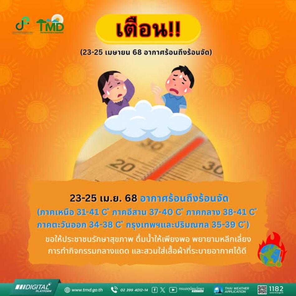 เตือน!! ช่วงวันที่ 23-25 เม.ย. 68 อากาศร้อนถึงร้อนจัด [24 เมษายน 2568]