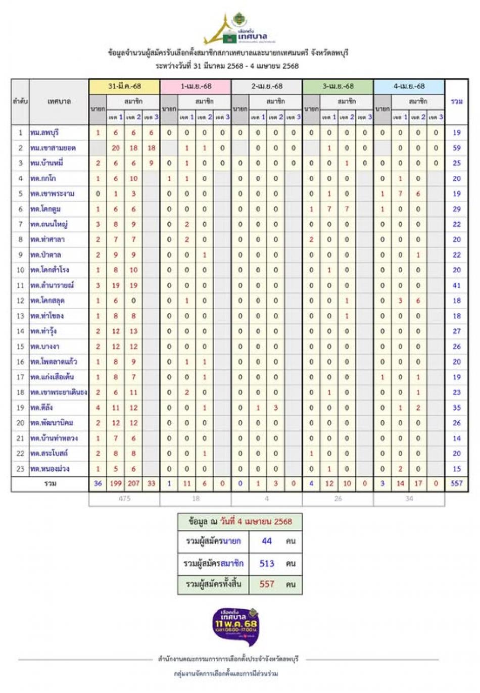 จำนวนผู้สมัครรับเลือกตั้งสมาชิกสภาเทศบาล และนายกเทศมนตรี ของจังหวัดลพบุรี [5 เมษายน 2568]