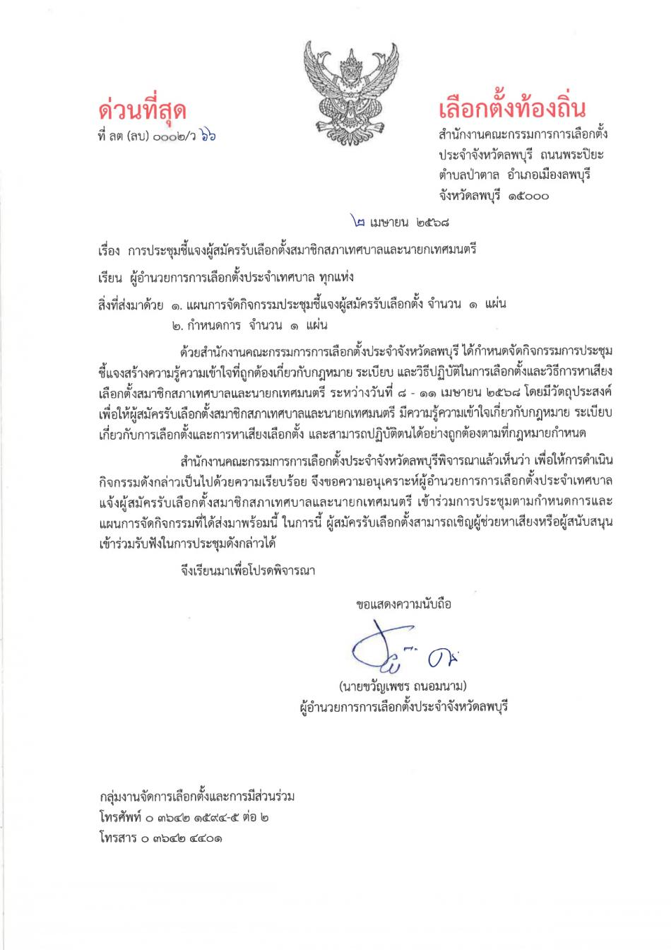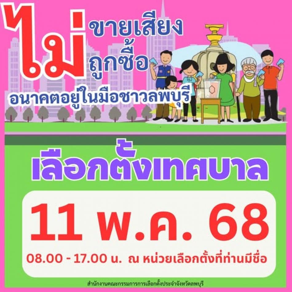 11 พฤษภาคม 2568 เชิญชวนชาวจังหวัดลพบุรี ไปใช้สิทธิเลือกตั้งสมาชิกสภาเทศบาลและนายกเทศมนตรี [9 เมษายน 2568]