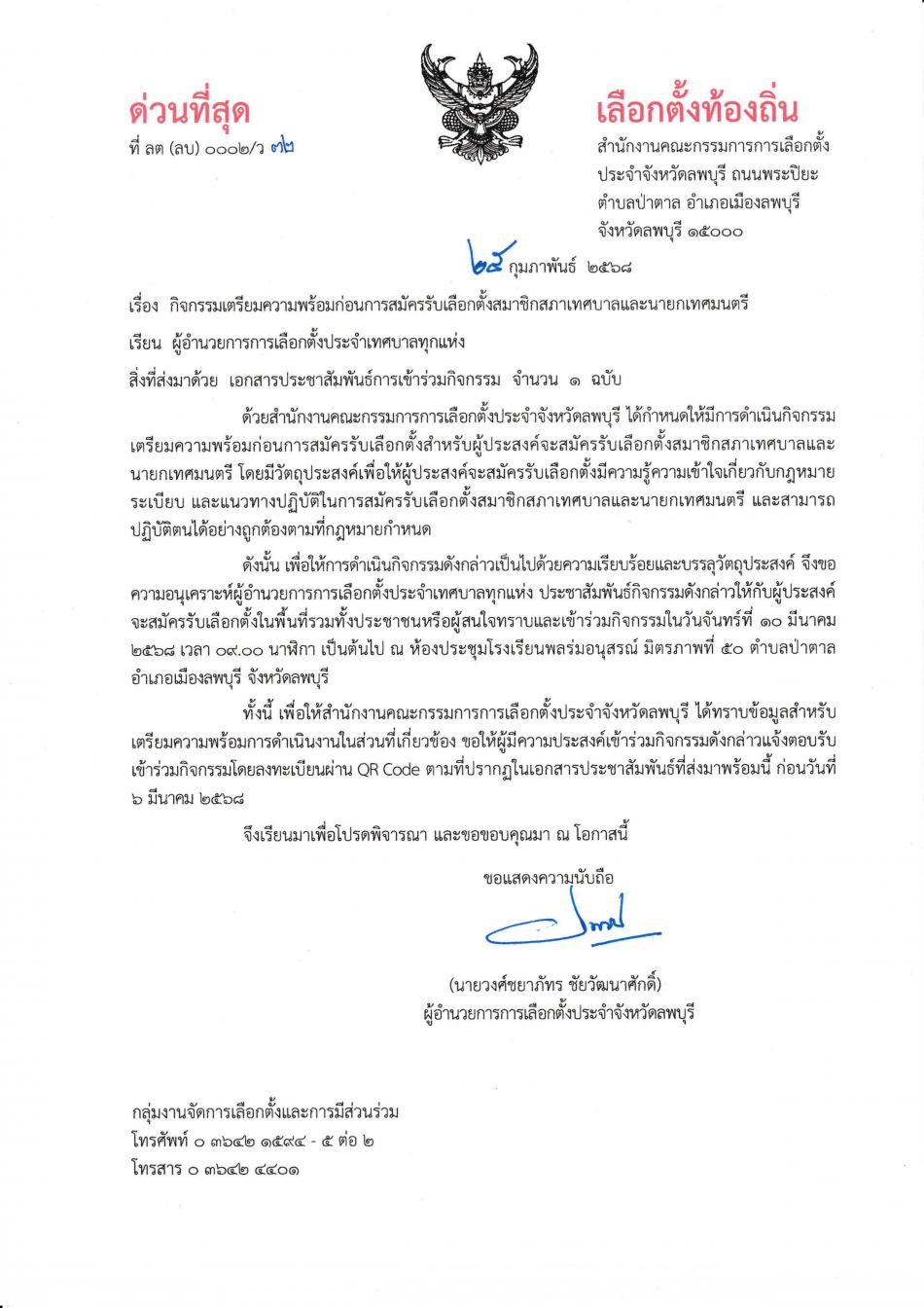 สำนักงานคณะกรรมการการเลือกตั้งประจำจังหวัดลพบุรี ประชาสัมพันธ์กิจกรรมเตรียมความพร้อมก่อนการสมัครรับเลือกตั้งสมาชิกสภาเทศบาลและนายกเทศมนตรี [26 กุมภาพันธ์ 2568]