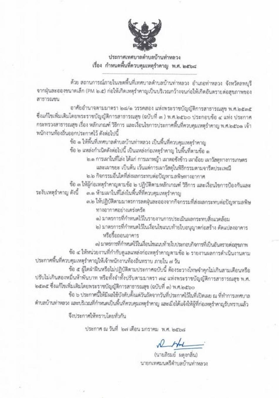 ประกาศเทศบาลตำบลบ้านท่าหลวง เรื่อง กำหนดพื้นที่ควบคุมเหตุรำคาญ พ.ศ.2568 [14 กุมภาพันธ์ 2568]