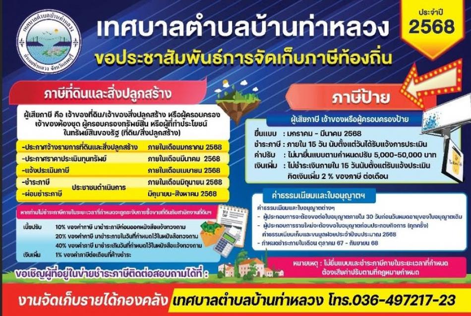 เทศบาลตำบลบ้านท่าหลวง ขอประชาสัมพันธ์ กำหนดการจัดเก็บภาษีท้องถิ่น ประจำปี2568 [20 มกราคม 2568]