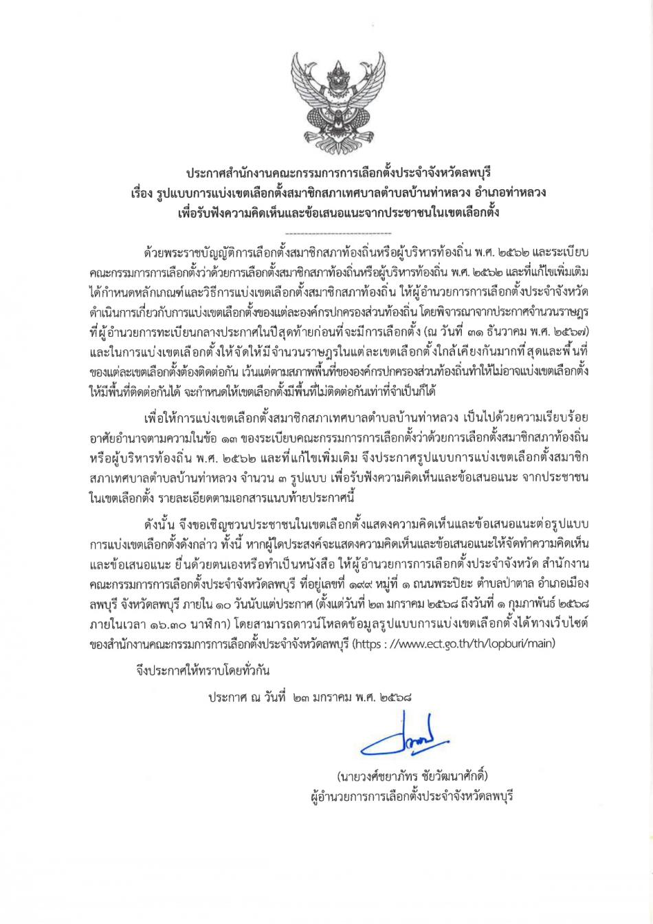 ประกาศสำนักงานคณะกรรมการการเลือกตั้งประจำจังหวัดลพบุรี เรื่อง รูปแบบการแบ่งเขตเลือกตั้งสมาชิกสภาเทศบาลตำบลบ้านท่าหลวง อำเภอท่าหลวง เพื่อรับฟังความคิดเห็นและข้อเสนอแนะจากประชาชนในเขตเลือกตั้ง [23 มกราคม 2568]