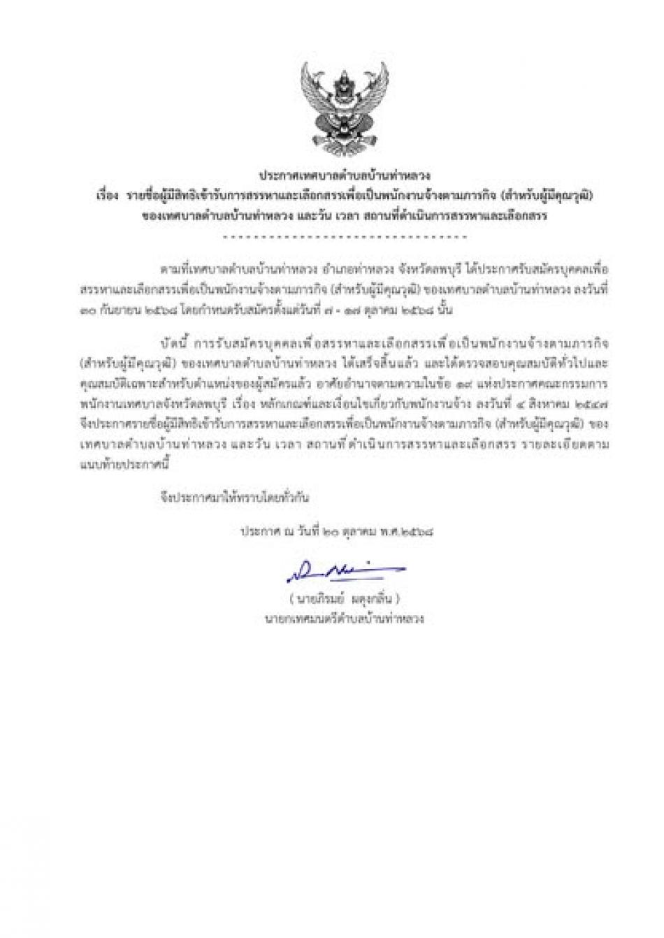 ประกาศ เทศบาลตําบลบ้านท่าหลวง เรื่อง รายชื่อผู้มีสิทธิเข้ารับการสรรหาและเลือกสรรเพื่อเป็นพนักงานจ้างตามภารกิจ [20 ตุลาคม 2568]