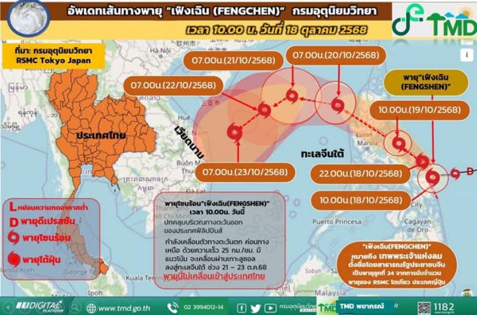 อัพเดทเส้นทางพายุโซนร้อน “เฟิงเฉิน” เวลา 10.00 น. (18 ตุลาคม 2568) [18 ตุลาคม 2568]