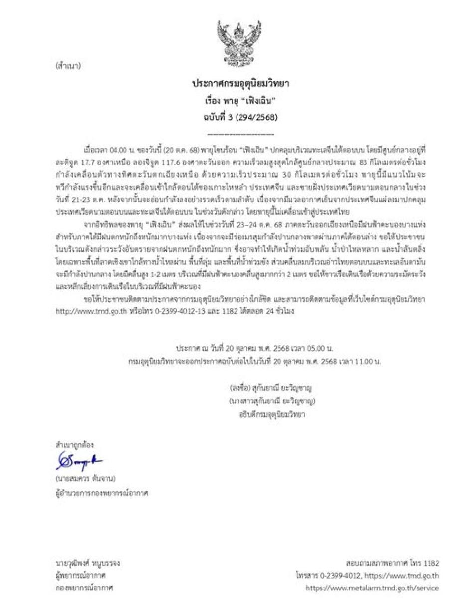 ประกาศกรมอุตุนิยมวิทยา เรื่อง พายุ “เฟิงเฉิน” ฉบับที่ 3 (294/2568) [20 ตุลาคม 2568]