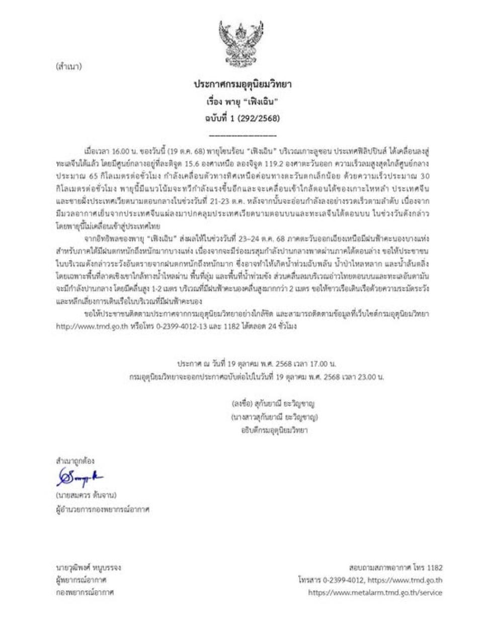 ประกาศกรมอุตุนิยมวิทยา เรื่องพายุ "เฟิงเฉิน" ฉบับที่ 1 [19 ตุลาคม 2568]