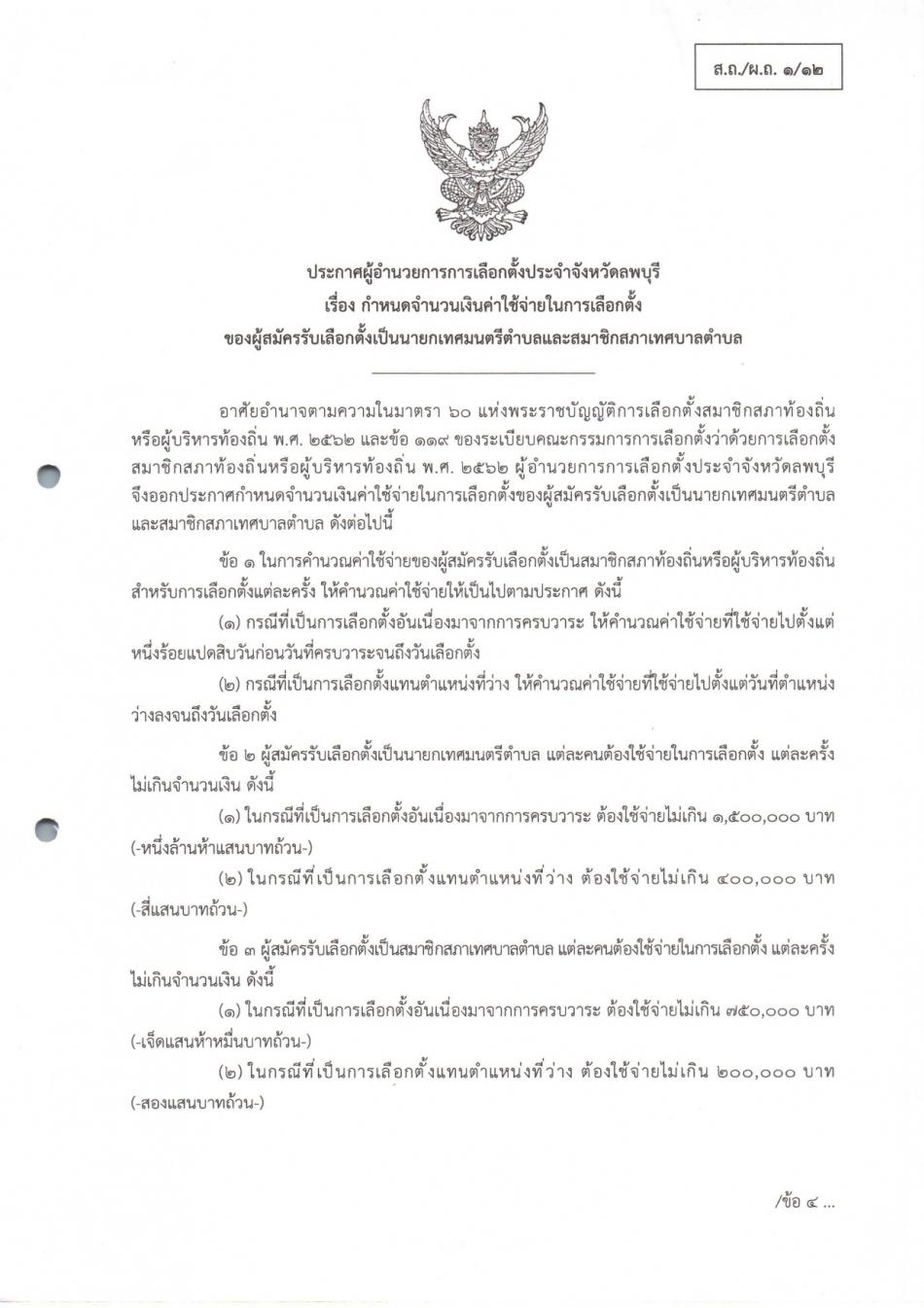 ประกาศผู้อำนวยการการเลือกตั้งประจำจังหวัดลพบุรี เรื่อง กำหนดจำนวนเงินค่าใช้จ่ายในการเลือกตั้งของผู้สมัครรับเลือกตั้งเป็นนายกเทศมนตรีตำบลและสมาชิกสภาเทศบาลตำบล [16 กันยายน 2567]