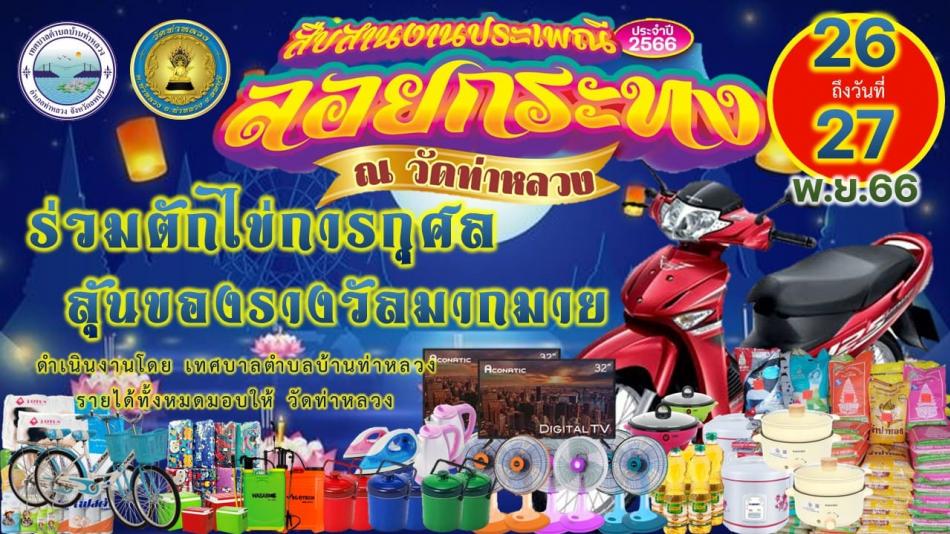 ขอเชิญเที่ยวงานประเพณีลอยกระทง ประจำปี 2566 วัดท่าหลวง ต.ท่าหลวง อ.ท่าหลวง จ.ลพบุรี [15 พฤศจิกายน 2566]