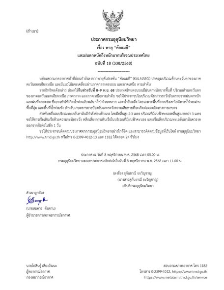 ชื่อเรื่อง : ประกาศกรมอุตุนิยมวิทยา เรื่อง พายุ “คัลแมกี” และฝนตกหนักถึงหนักมากบริเวณประเทศไทย ฉบับที่ 18 (338/2568)